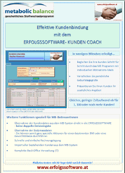 In enger Zusammenarbeit mit der Metabolic Balance GmbH. in Isen haben wir eine interessante Ankopplung unserer ERFOLGSSOFTWARE an das MB-System geschaffen.