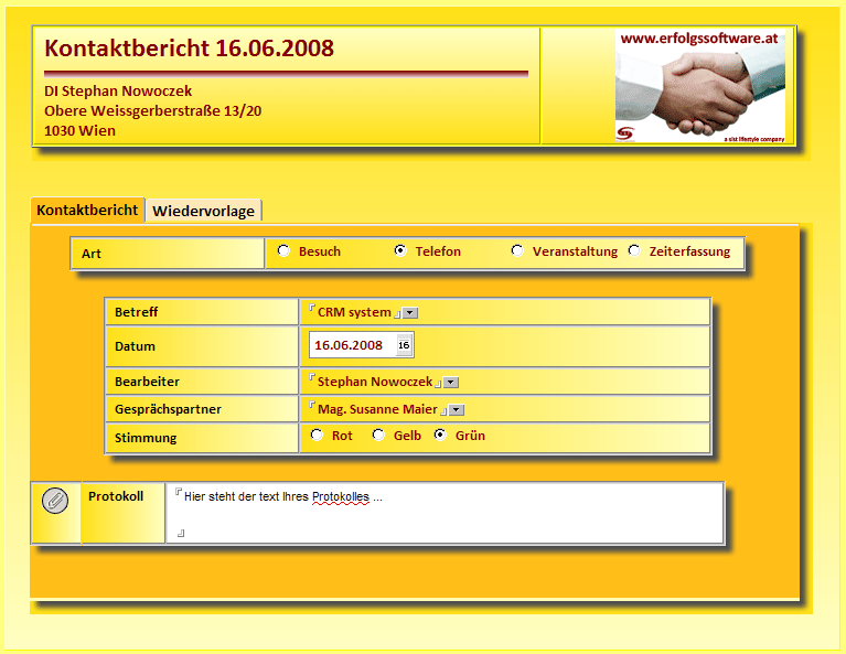 Wie die meisten Masken ist auch der Kontaktbericht mit einer Wiedervorlagefunktion ausgestattet. Das bedeutet Sie verpassen keinen Termin mehr!