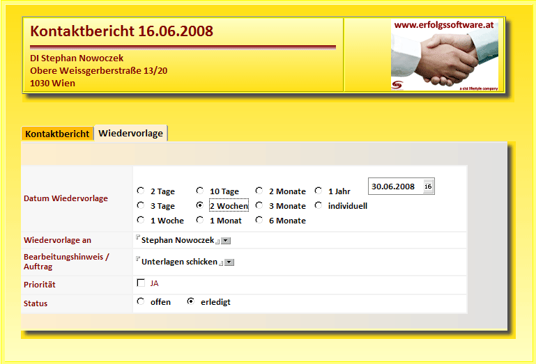 Die Wiedervorlagefunktion steht Ihnen bei fast allen Masken zur Vefügung. Damit können Sie gleich in einem Arbeitsschritt erfassen, wann Ihre Software Sie an einen Rückruf oder ein zu legendes Angebot erinnern soll.